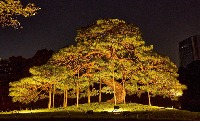 琵琶湖の唐崎のマツを模した見事な枝ぶりのマツを照らし出します。