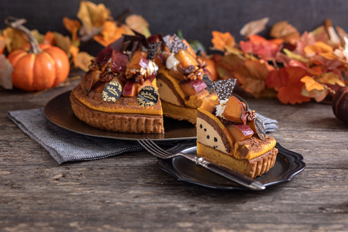 かぼちゃケークタルトに北海道産のかぼちゃクリームとキャラメルクッキークリームを重ね、しっとりとなめらかな食感で上品な甘みとオレンジ色の果肉が特徴のハロウィンスイートを飾りました。