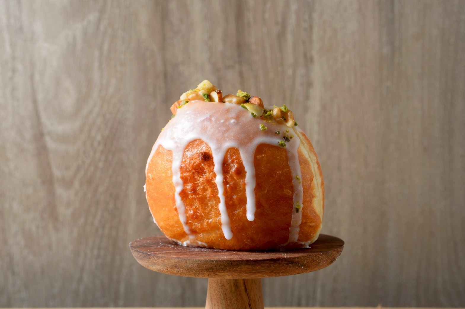 北海道産の生クリームをビターなキャラメルで仕立てたほのかな苦さと甘さが織りなす奥深い味わいの特製クリームです。さらに北海道産生乳をコーティングし、くるみ、ナッツをトッピングした気品溢れる生仕立てドーナッツです。