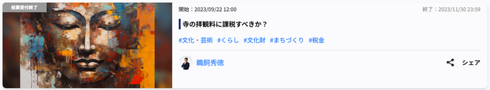 SNSとテクノロジーで社会課題の発見・解決をサポートするPolimill株式会社(ポリミル、本社:東京都港区、代表取締役:横田えり、以下Polimill社)はこのたび、「寺の拝観料に課税すべきか?」というイシュー(課題)について11月30日に投票が終了しましたので結果をお知らせします。