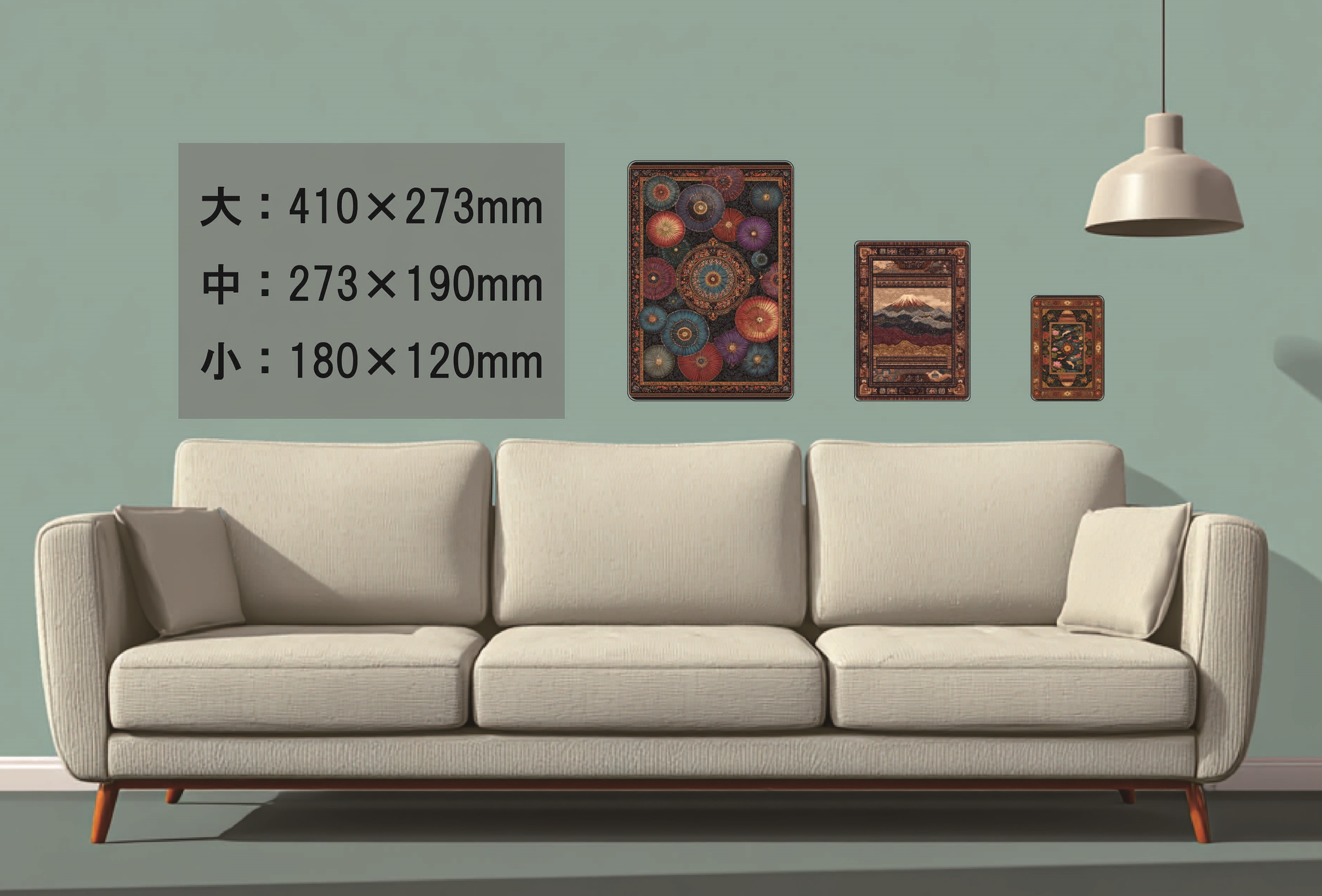 さらに3パターンのサイズを各種ご用意しているので、リビングや玄関・寝室はもちろん、賃貸住宅やオフィスでも気軽に楽しめるなど、設置場所やご利用シーンを選びません。