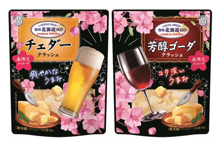 『雪印北海道100 芳醇ゴーダ クラッシュ』、『雪印北海道100 チェダー クラッシュ』(各50g)の春限定のパッケージを2022年2月中旬から3月下旬(予定)まで展開します。
