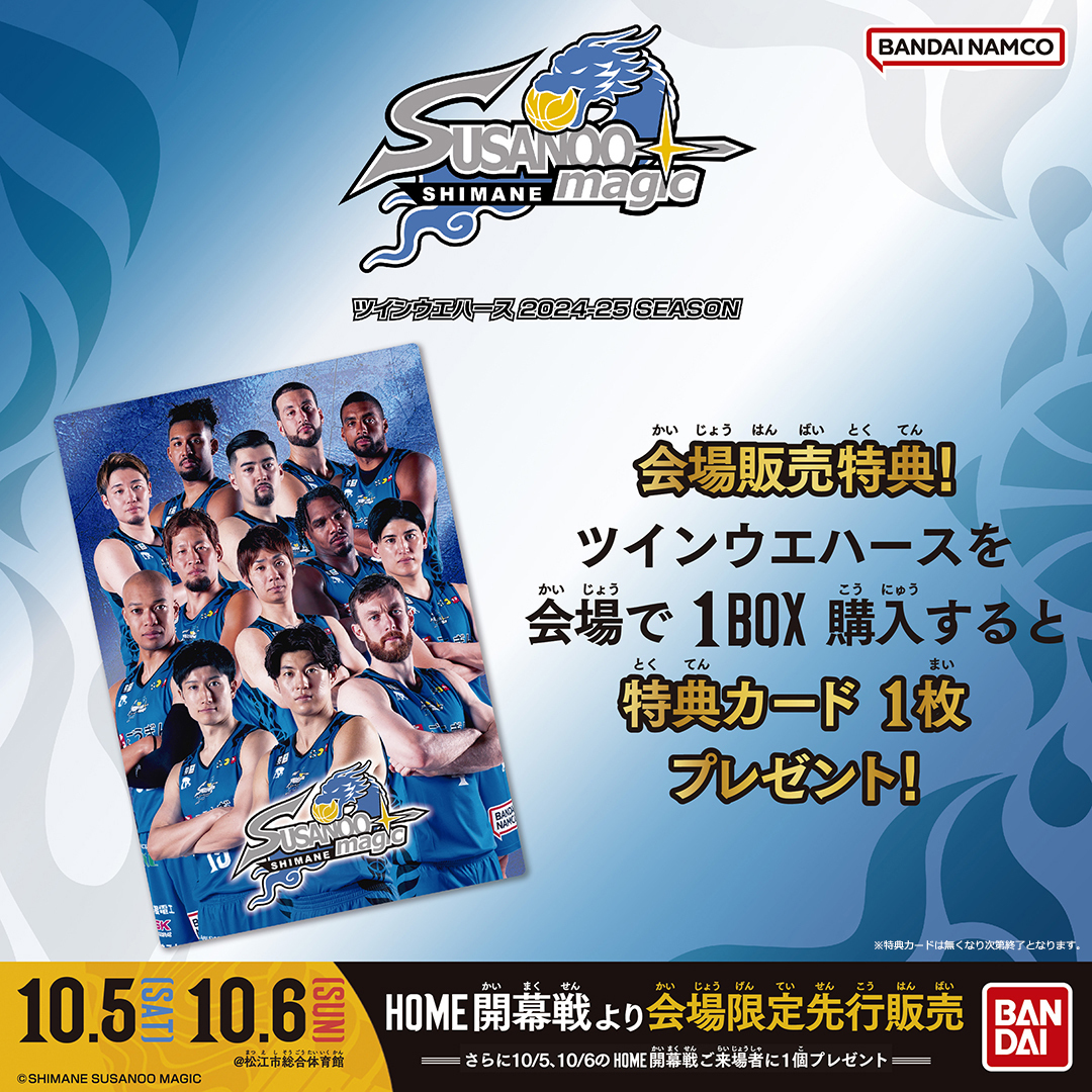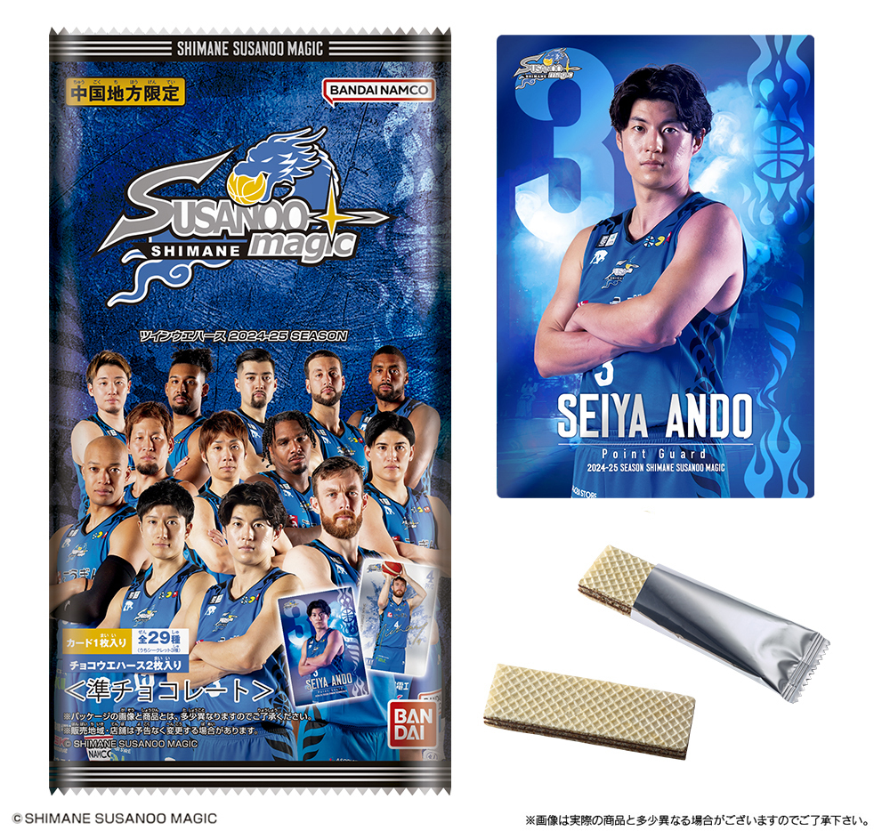 株式会社バンダイ キャンディ事業部と株式会社バンダイナムコ島根スサノオマジックは、昨シーズンに引き続き、B.LEAGUE 2024-25シーズン開幕を記念して、『島根スサノオマジック』のカード付きウエハース(220円 税込)を、2024年11月11日(月)より中国地方のスーパー・コンビニエンスストアなどのお菓子売場にて発売します。