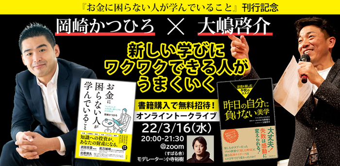 第1回は3月12日(土)14時より 井上裕之×岡崎かつひろ オンライントークライブ 「一流の学び力」、第2回は3月16日(水)20時より 大嶋啓介×岡崎かつひろ オンライントークライブ 「新しい学びにワクワクできる人が、うまくいく」を開催!となります。