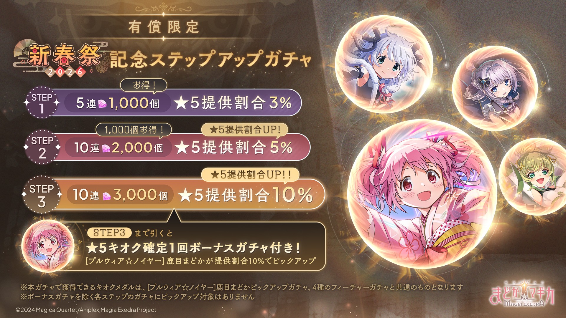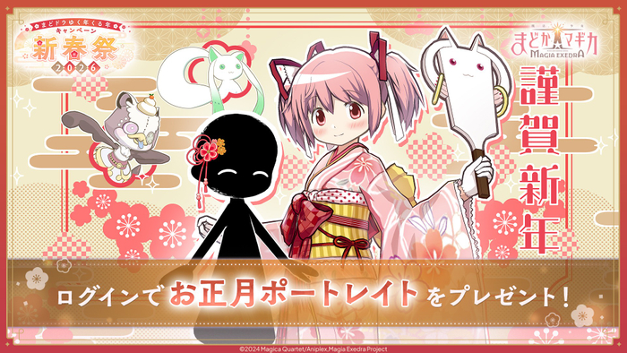 株式会社アニプレックス(本社:東京都千代田区 代表取締役 岩上敦宏 以下アニプレックス)は、アプリゲーム『魔法少女まどか☆マギカ Magia Exedra』(Magia Exedra:マギアエクセドラ)において、2026年1月1日(木)0時より、「ゆく年くる年キャンペーン 新春祭-2026-」を開催し、お年玉として初日ログインだけでマギカストーン3,000個プレゼントや、1日1回無料ガチャ、マギカストーンが必ず当たるまどドラくじ等の豪華キャンペーンを開始いたしました。さらに、晴着姿の限定★5キオク[プルウィア☆ノイヤー]鹿目まどかが登場するピックアップガチャを開始いたします。