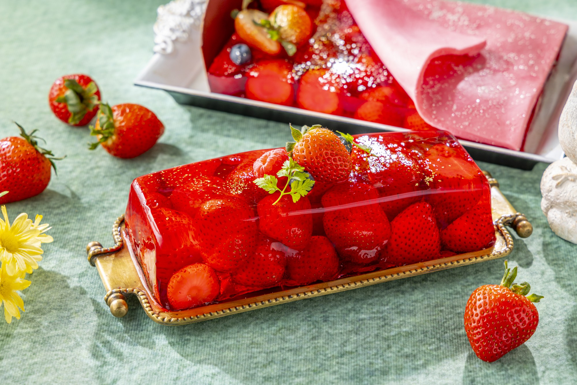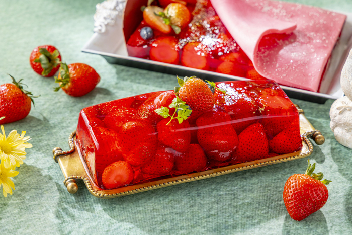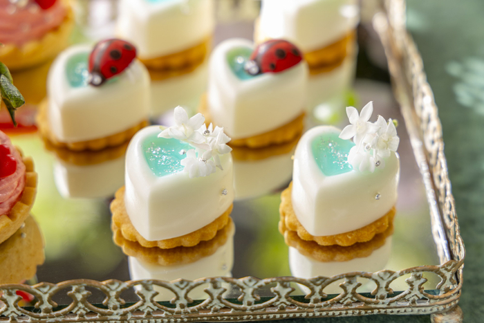 水辺の近くに住む苺の妖精たちが開催するティーパーティーがテーマ。フレッシュ苺をふんだんに詰め込んだ苺のゼリーテリーヌや、北海道練乳を使った濃厚クリームと合わせた苺みるくショートケーキ、苺のクリームで仕上げたふわふわの苺シフォンなど、苺好きにはたまらないスイーツをご用意します。さらに、バルサミコビネガーやバジルが効いたストロベリーチーズケーキ、ほのかな苦みと爽やかな香りが広がる柚子と苺のゼリー、ジャスミンティーと苺を合わせた上品なマカロンなど、ハーブや茶葉などを組み合わせて苺の魅力を引き出したスイーツが勢揃い。その他にもメロン生クリームとカスタードを巻き上げたメロンロールや、切り株に見立てたチョコレートズコットケーキ、3種類のフルーツでカラフルに仕上げたゼリーボールなど、約20種類のスイーツをお楽しみいただけます。