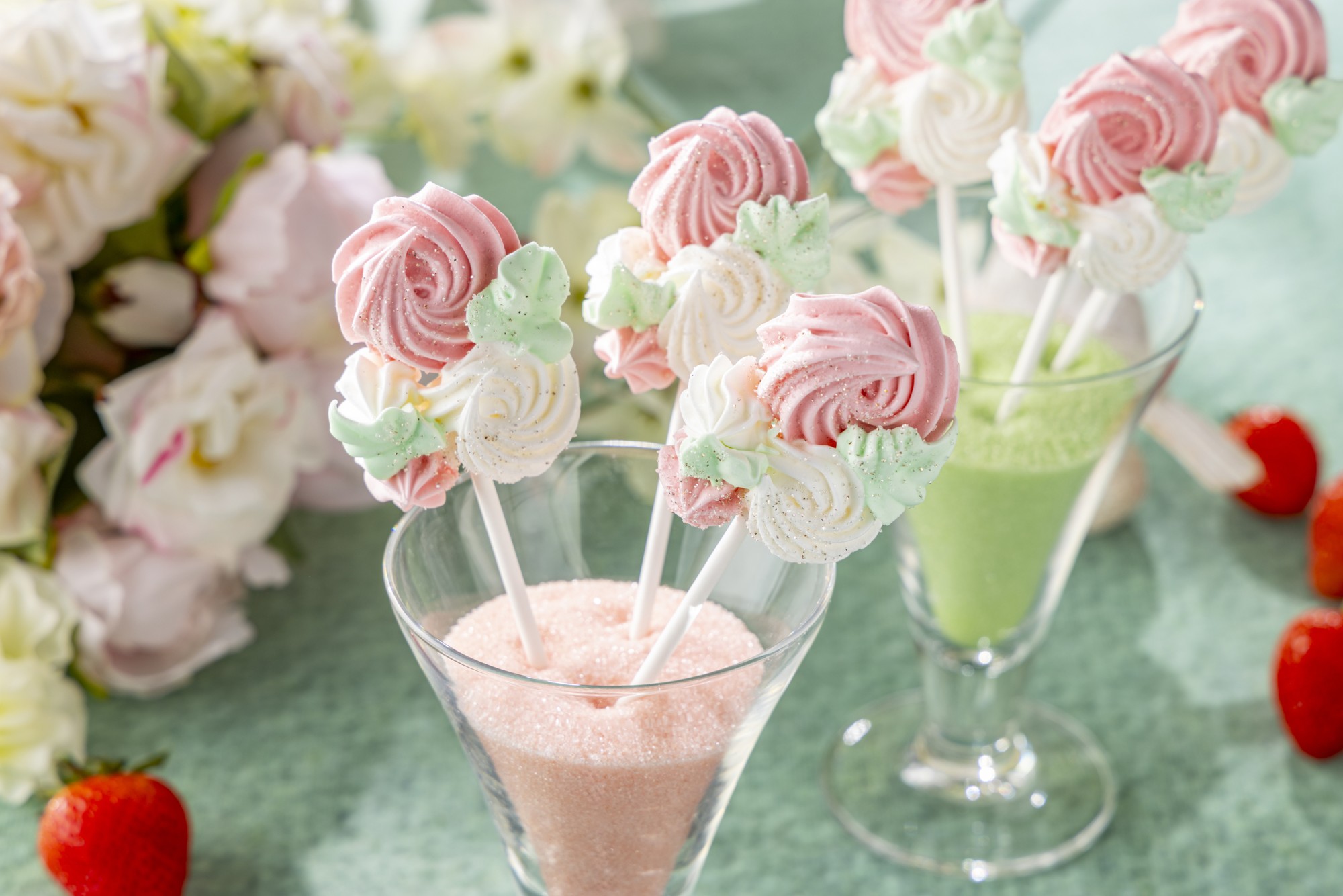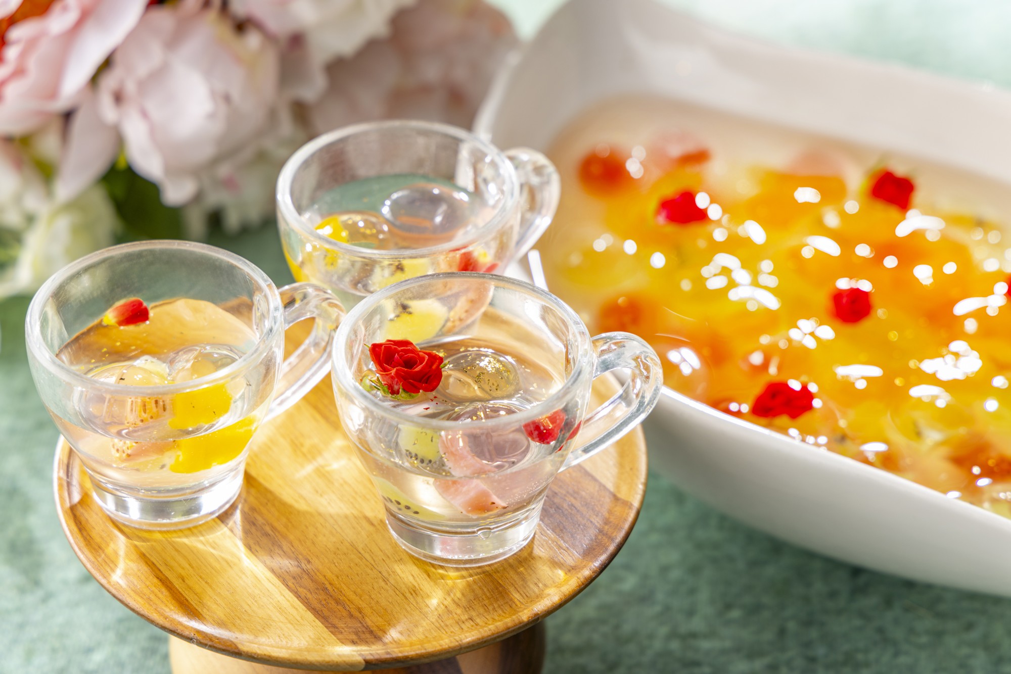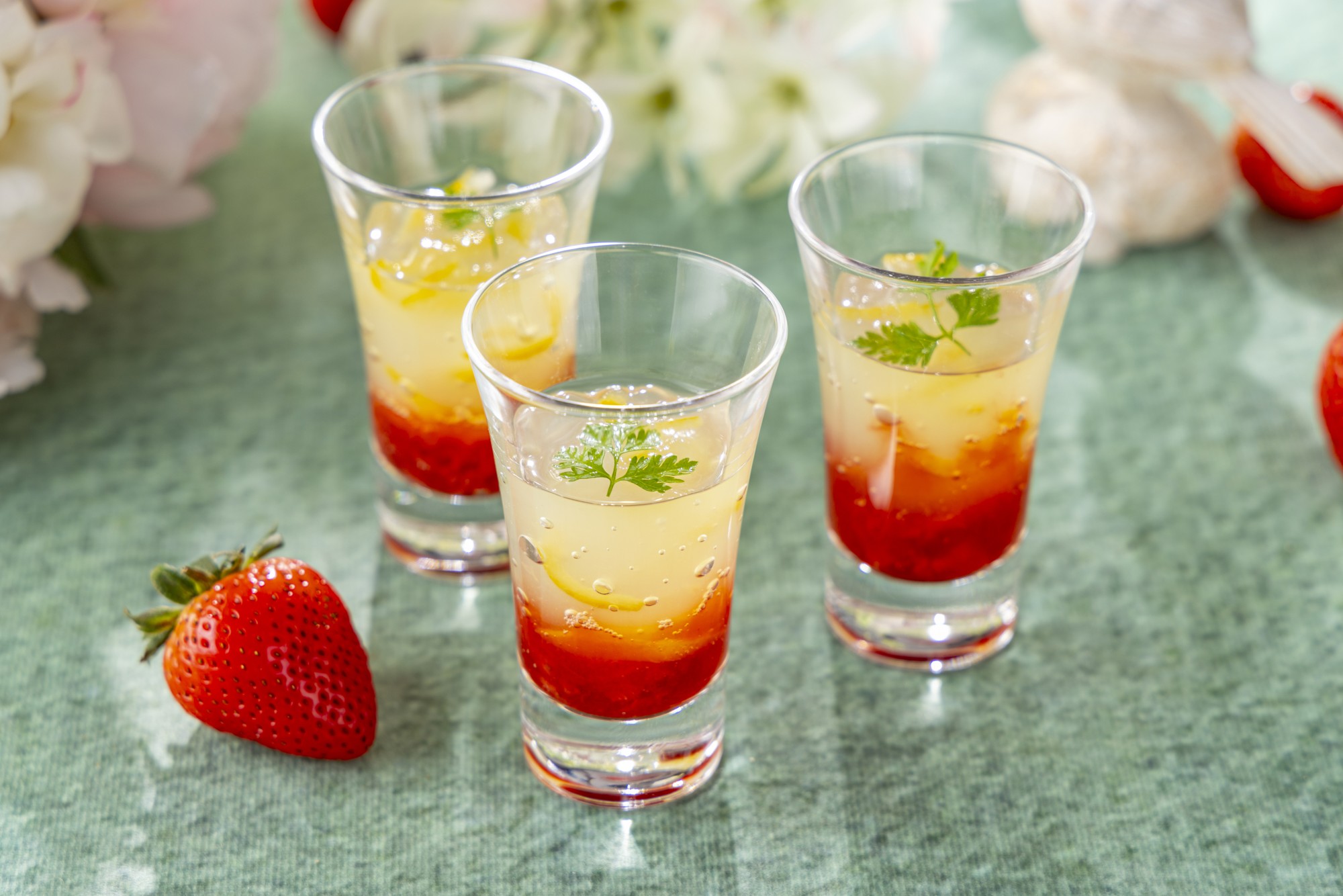 グラスの底に敷き詰めたのは、クラッシュしたローズと苺のゼリー。そこに潰した苺の果実とシロップを重ね、アセロラジュースを注いだ、爽やかな酸味が広がるドリンクです。口に広がる苺の果肉の食感もお楽しみいただけるよう、潰した状態でご用意しました。トップには、純白のエディブルフラワーをあしらい、妖精の魔法の粉をイメージした銀粉をふんわりと。さらに苺とドライレモンを飾り、見た目にも華やかな一杯に仕上げました。春の訪れを感じさせる、可憐で幻想的なドリンクをぜひご堪能ください。
