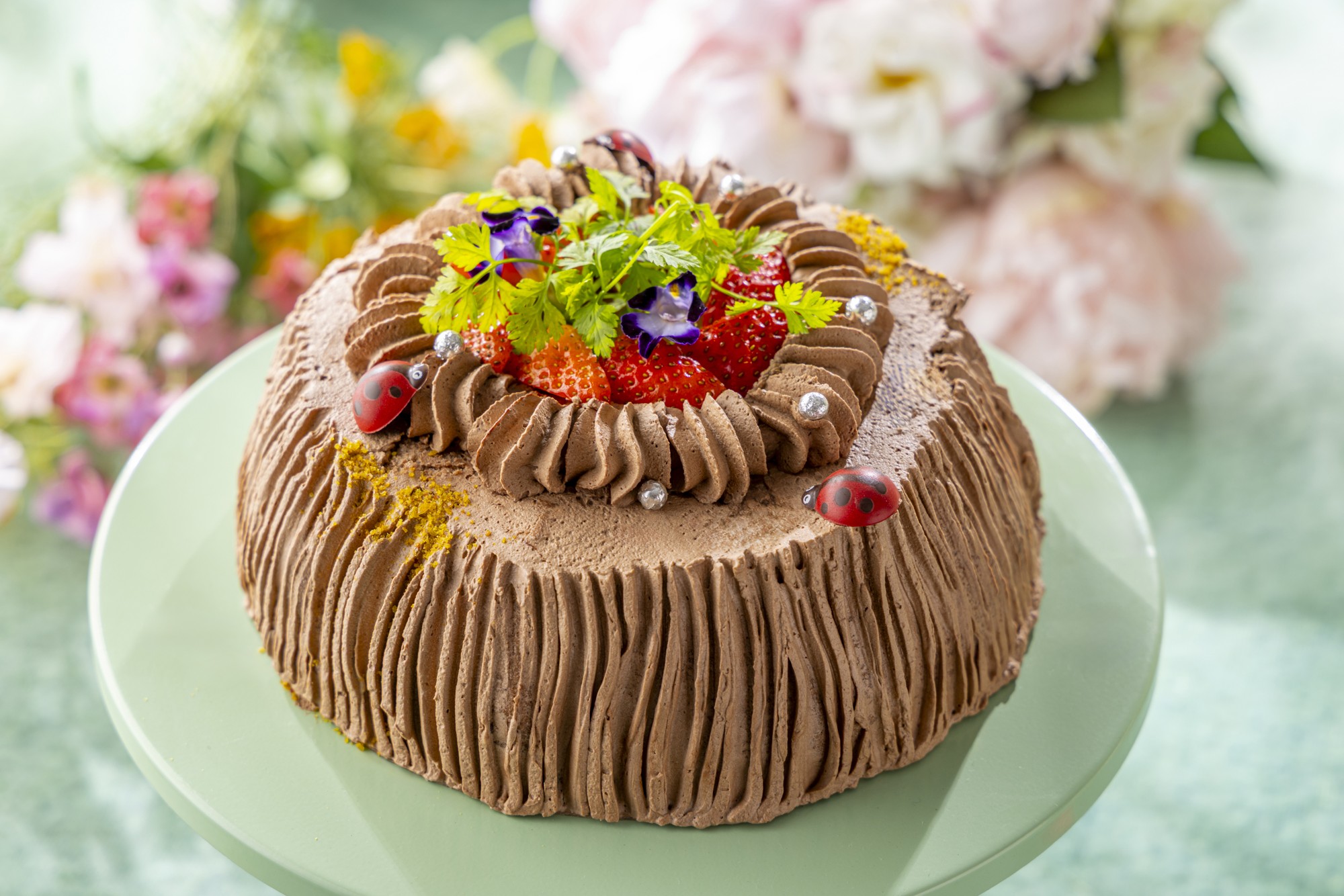 切り株のように見えるよう仕上げたチョコレートケーキ。 くるみやシリアルチョコレートで食感にアクセントを加えました。準備を手伝うてんとう虫のチョコレートがさりげないポイントです。