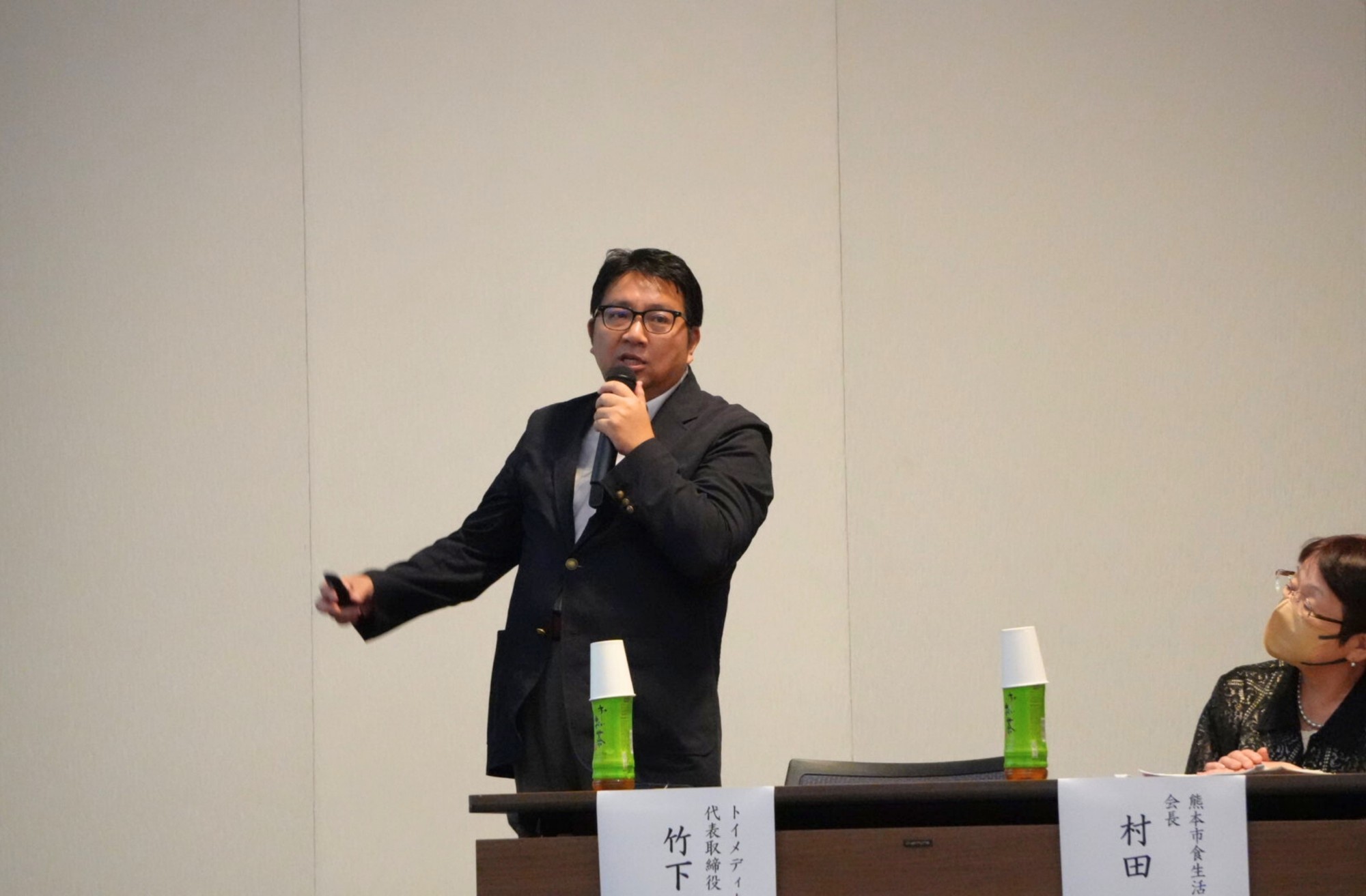 今回のCKD協議会は「食へのアプローチ」をテーマに開催され、関連企業や団体が各々の取り組みを紹介。従来の減塩とは異なるアプローチ技術を開発し、関連商品を取り扱う当社代表・竹下英徳が登壇しました。