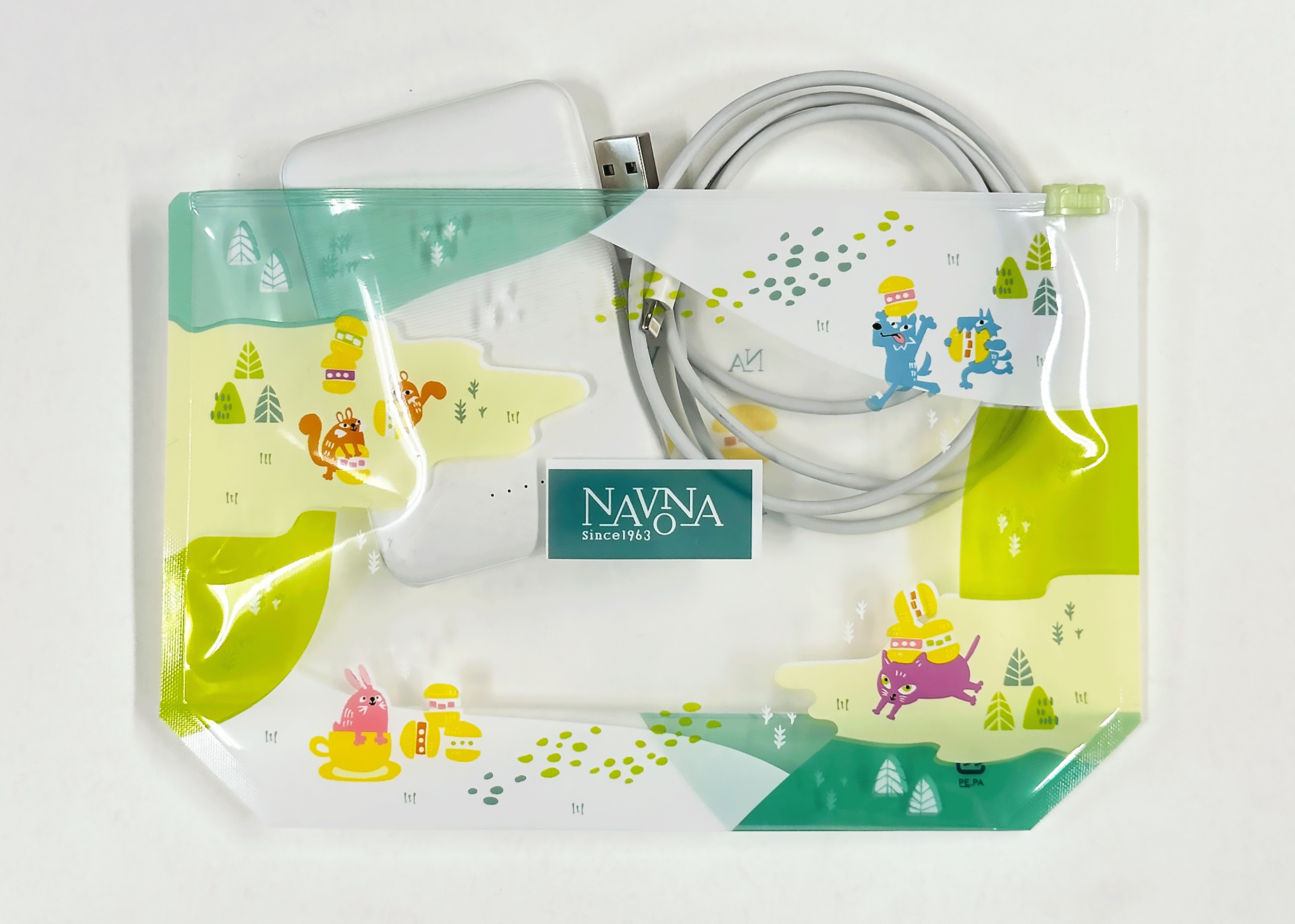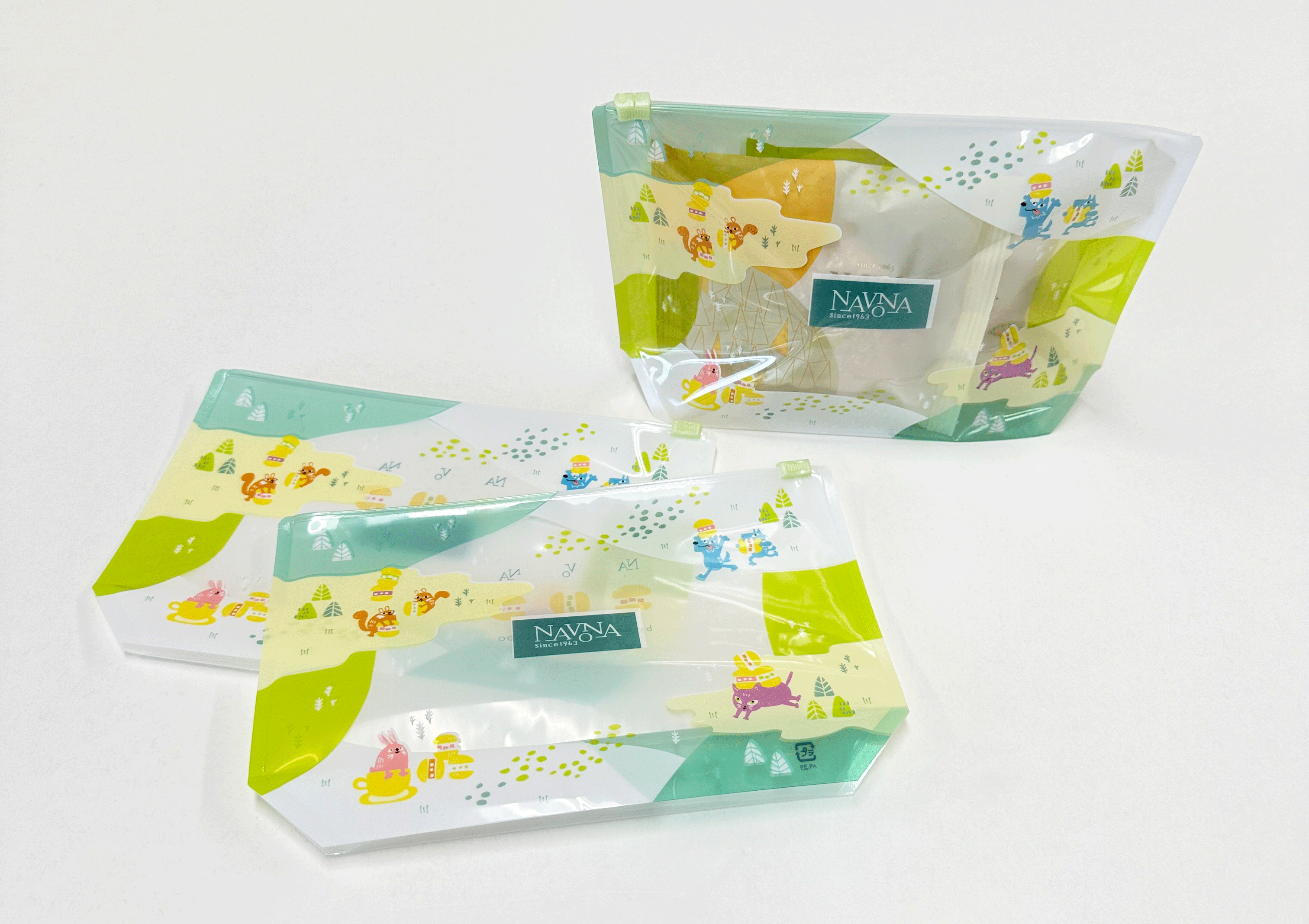 可愛らしい森の動物たちがナボナを楽しんでいる様子が描かれたポーチは、ビニール素材でジッパー付、横幅20㎝×縦13㎝×奥行5㎝のサイズで、小物入れにも再利用が可能です。