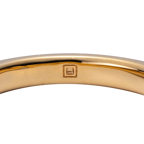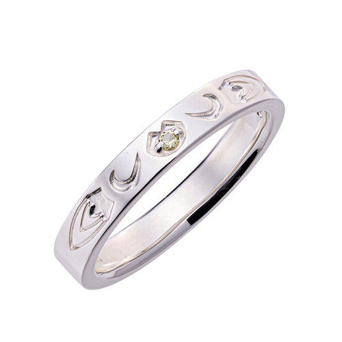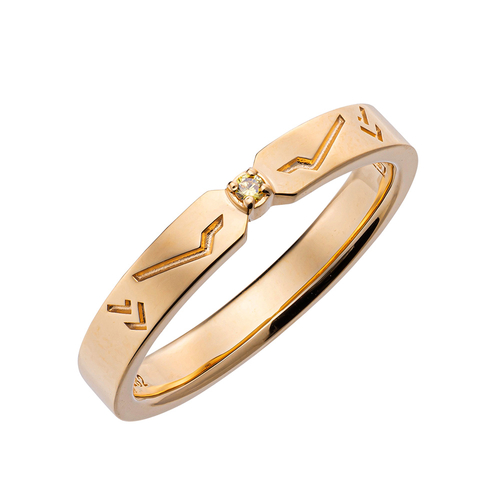 頭の角モチーフを取り込んだ段差のある平打ちフォルムの表面に、イメージカラーストーンをセット。内側にはハットの形を刻印しました。