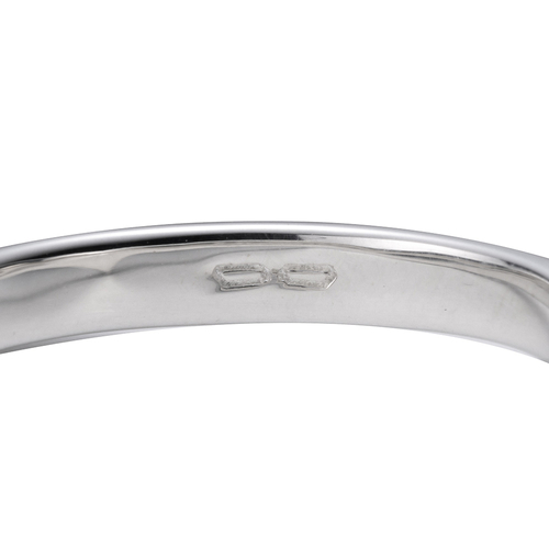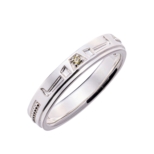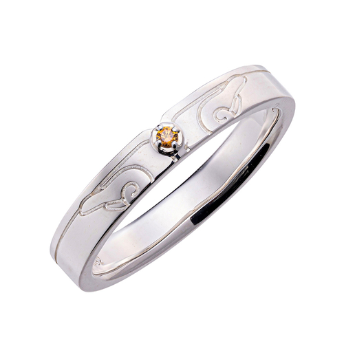 スーツの胸元の模様を取り込んだなめらかな平打ちフォルムの表面にイメージカラーストーンをセット。内側にはジョンとジョンジョンの足跡の形を刻印しました。