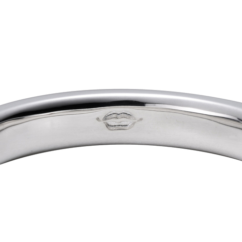スーツの胸元の模様を取り込んだなめらかな平打ちフォルムの表面にイメージカラーストーンをセット。内側には唇の形を刻印しました。