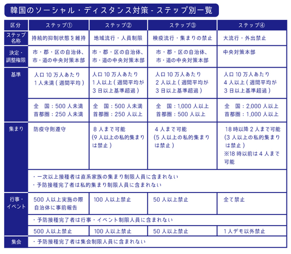 現在、韓国では7月12日から2週間、首都圏におけるソーシャルディスタンス対策―初のステップ4が施行されています。日本では「緊急事態宣言」がありますが、韓国では、感染者率に応じてその措置内容が異なる段階別防疫策=「ソーシャルディスタンス対策―ステップ型」となっています。