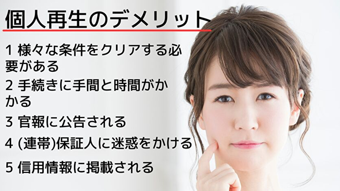 個人再生のデメリットを5つ紹介します。借金の大幅な減額ができる代わりに、手続き面などでデメリットは存在します。