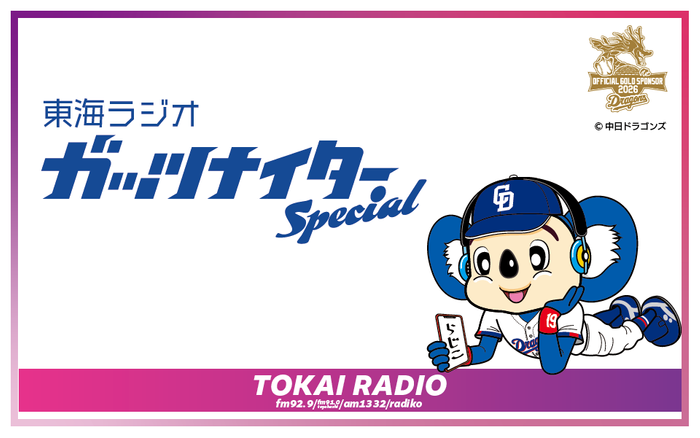 3月21日(土)14時00分から17時00分まで「ガッツナイタースペシャル プロ野球オープン戦 実況中継」を放送する。バンテリンドーム ナゴヤで行われる中日×ロッテのオープン戦を実況中継。解説は、2026シーズンより「ガッツナイター」解説者に就任した中田翔が務める。実況は、森貴俊(TOKAI RADIO アナウンサー)。
