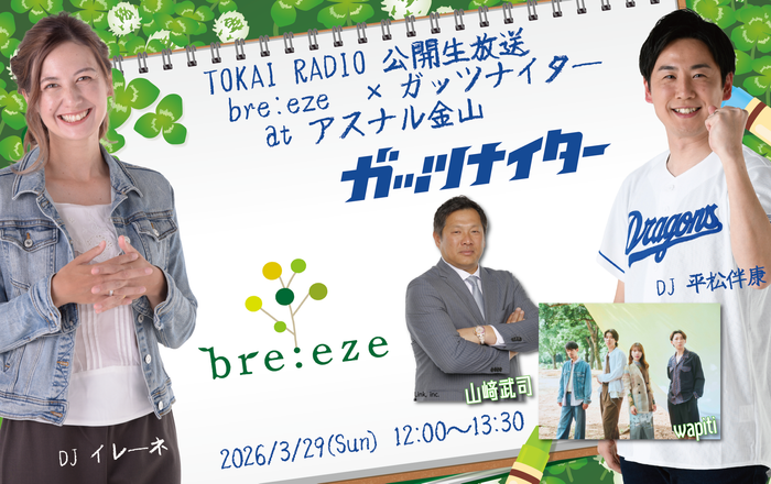 29日(日)12時00分から13時30分には「TOKAI RADIO 公開生放送 bre:eze× ガッツナイタ― at アスナル金山」を、名古屋市中区のアスナル金山で実施する。開催。第1部は「bre:eze」DJのイレーネが、第2部には平松伴康、ガッツナイター解説者の山﨑武司、2026年テーマソングを担当するwapitiが登場する。wapitiはミニライブも予定されている。観覧は自由。