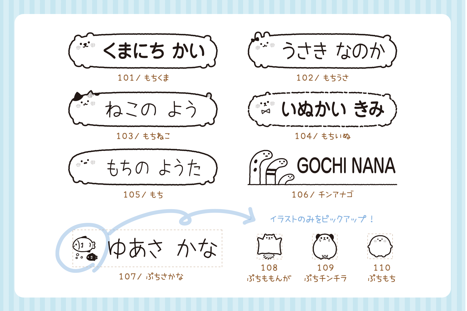 文字の読めないお子さまでも認識しやすいと好評の“いらすとフレーム”シリーズに、もちっとしたカワイイフォルムのシリーズが登場。クマのような、ウサギのような、猫のような…オムツスタンプ以外の用途としても使いたくなる、愛着の湧くイラストです。その他に、チンアナゴやモモンガ、お魚やチンチラなども仲間入りしました。
