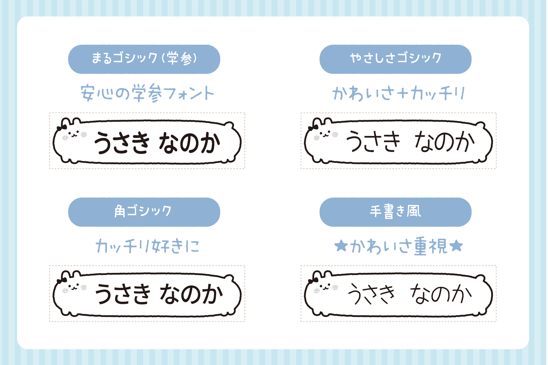 学参・旧字に対応した「まるゴシック」からかわいい「手書き風」まで、全4種類のフォント(書体)から選ぶことができます。また、ひらがなだけではなく漢字やローマ字にも対応しています。