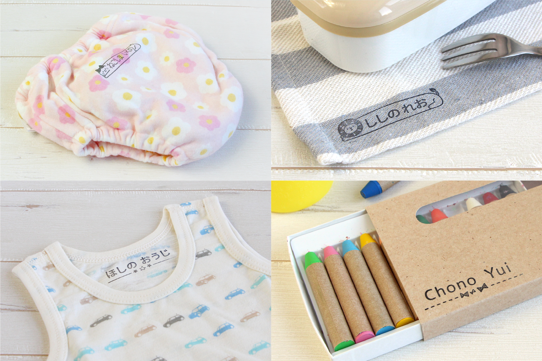 生地に押してそのまま洗濯することができるので、布オムツやトレーニングパンツ、パンツと段階に応じてお使いいただくことができます。さらに、ランチョンマット、お昼寝布団カバー、上靴袋など、大きめサイズの持ち物にもお使いいただけます。文具や食器にも押すことができ、食洗機にも対応しています。このスタンプ1本でさまざまなものに名前つけができます。