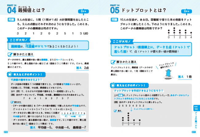 2020年度からの新学習指導要領では、ドットプロットという用語や、それまで中学数学の範囲だった代表値、階級などの用語が、小学算数の範囲である「データの調べかた」の単元に加わりました。本書では、これらの新たな範囲についてもしっかりと解説しています。