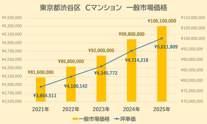 Cマンションの一般市場価格・坪単価の推移は上記【図5】の通りです。