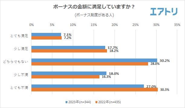 「どちらでもない」(30.2%)が最も多い回答となりました。昨年の同調査と比較すると「とても満足」(2023年:7.1%、2022年:7.2%)、「少し満足」(2023年:17.7%、2022年:18.2%)とボーナスに対する満足度はいずれも微減、「とても不満」(2023年:27.0%、2022年:30.3%)は3.2ポイント軽減したものの、「少し不満」(2023年:18.0%、2022年16.3%)が1.7ポイント増加となりました。