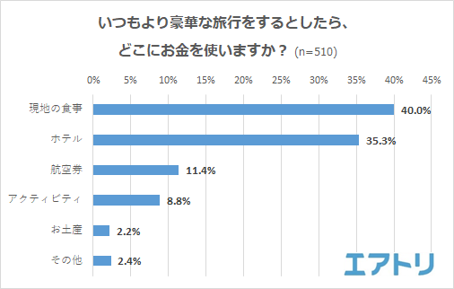 1位は40.0%の人が「現地での食事」と回答しました。2位は「ホテル」(35.3%)でした。