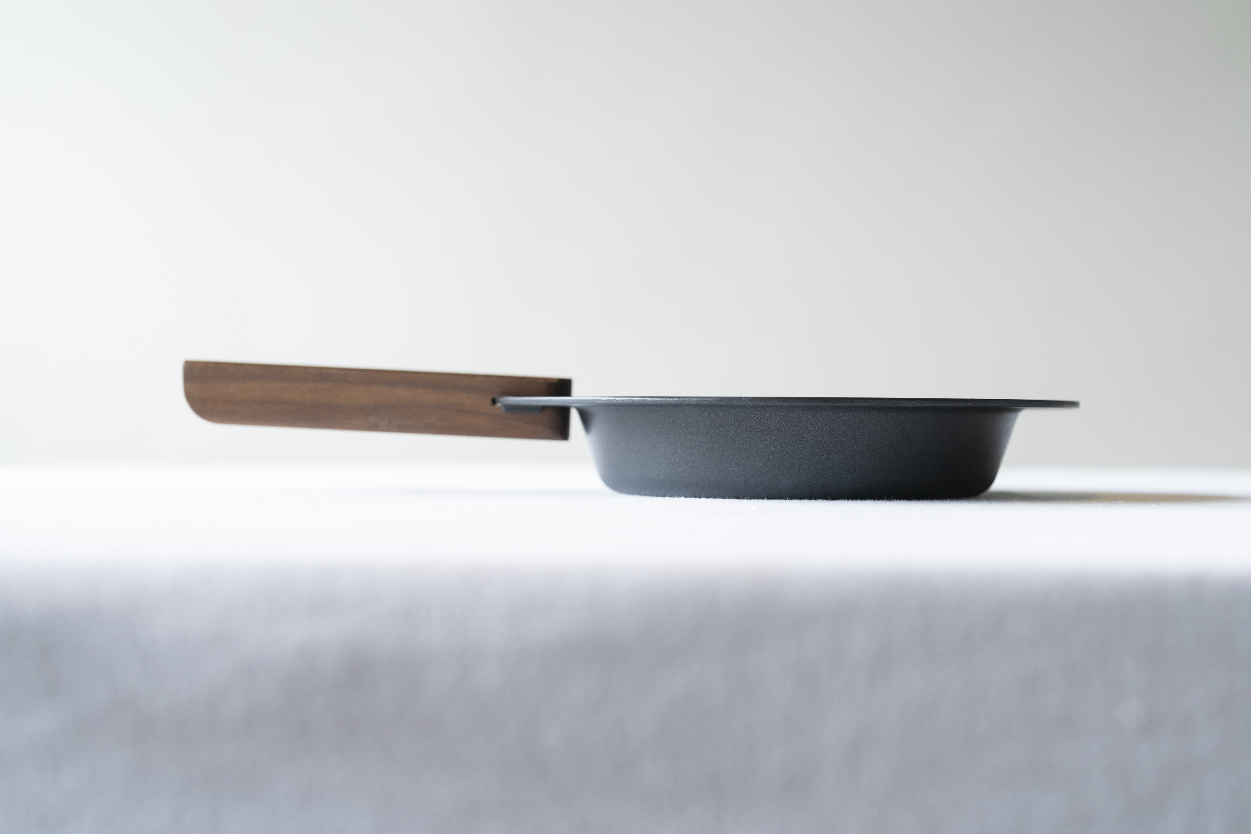 取っ手を差し込むだけでフライパンに変わる「ガイドチャックシステム」は、ロック不要でワンタッチ装着が可能。木製ハンドル部分はウォールナット無垢材を使用し、0.1mm単位で仕上げた精度が心地よい使用感を生み出します。