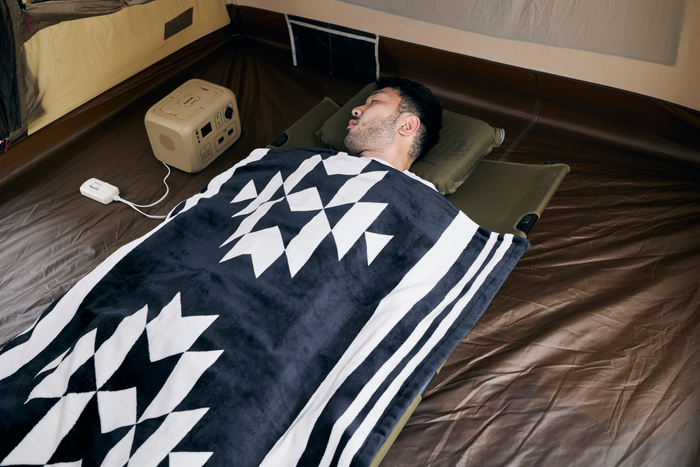 本製品は、アウトドアシーンにマッチする2種類のデザインを用意した電気掛敷毛布。キャンプや車中泊で使用することを想定して、中程度の容量(500Wh前後)のポータブル電源でも安心して一晩使用できるよう、消費電力と暖かさのバランスを考えました。さらに、表面にはポリエステル100%マイクロファイバー素材を採用。なめらかな肌触りはもちろん、丸洗いで衛生的に使用できます。