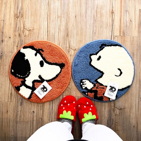 アクセントマットということで小さめ直径38センチ。ソファの上や椅子の上にも置ける大きさですね。見上げるスヌーピーと、楽しそうなチャーリーブラウン。今のスヌーピーのファンなのですが、こうしてみるとレトロデザインもかわいいですね。アメリカン雑貨の趣があります。
