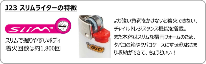 フランスに本社を置くBICライターは、国際標準化機構が定めた厳しい安全基準をクリアし、更に安全性の高いライターの生産をおこなっています。厳選された原材料の選定から始まり、精度の高い部品の生産および製品の組み立て、更には50項目以上の検査を経て、国際標準化機構の定めるライター規格ISO9994以上の高い安全基準を維持しています。その品質の高さが認められて、全世界160カ国以上の国でライターを販売しています。