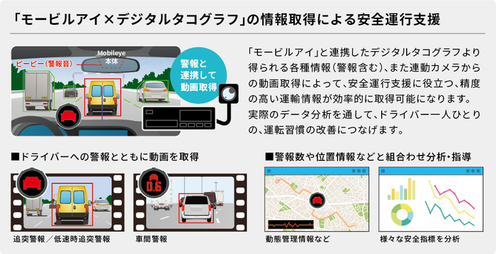 今回の導入にあたっては、モービルアイは通信型デジタルタコグラフ(ドライブレコーダー一体型)とともに運用され、事故防止に有効な5つの警報※1とその精度、また警報数の取得に代表される運転行動の把握、さらに様々な情報がリアルタイムに取得できること等が評価されました。本システムにおいて、ドライバー毎の運転習慣の把握とともにその改善に繋がるものと期待され、導入が決まりました。