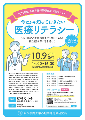 明治学院大学心理学部付属研究所は無料公開セミナー「今だから知っておきたい医療リテラシー」(コロナ禍での医療情報をどう受け止める? 振り返りと気づきを通して)を、10月9日(土)にオンラインで開催いたします。