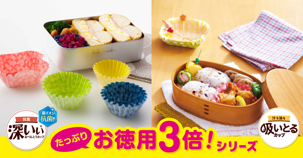弊社おべんとうカップをご愛用いただく方のお声から、大容量タイプへのご意見を多くいただいていました。さらに調査を実施し、お弁当作りの頻度が高い方にとって、使用するおかずカップの数も多くなるため、「お徳用」商品のニーズが高い事が確認できました。今回、人気のお弁当カップに「お徳用」としてさらに3アイテムを追加発売いたします。