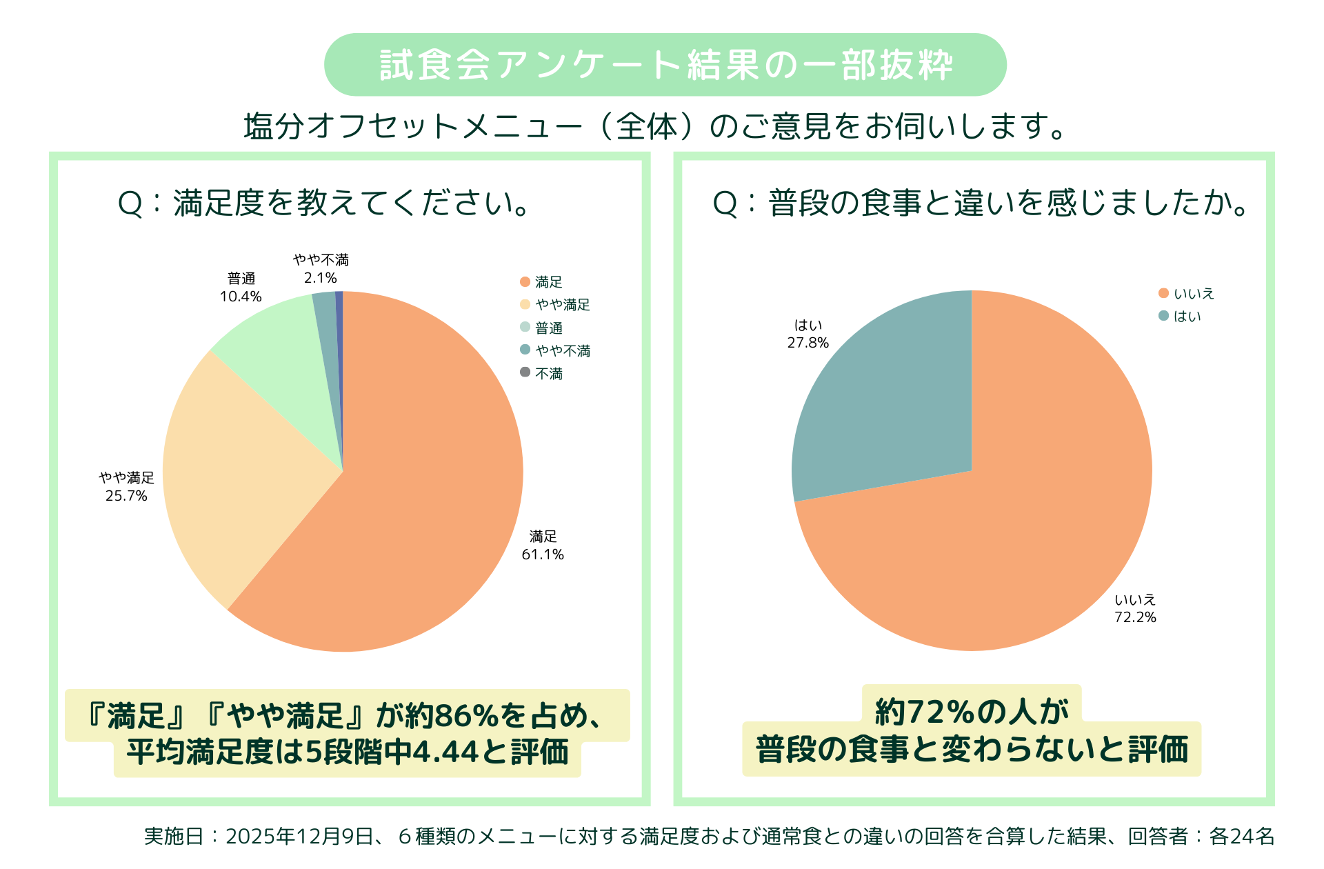 アンケートでは、喫食者より「味の違和感がなく、おいしく食べられた」「『物足りない』と言う感覚は全くなく、どれも美味しかった」など、塩分オフセットメニューに対して非常にポジティブなご意見が多数寄せられました。また、メニューの調理オペレーションに関しても、調理担当者全員(4名)が、調理に「ほとんど負担がない」、あるいは「全く負担がない」と回答しており、導入の容易さも確認されています。