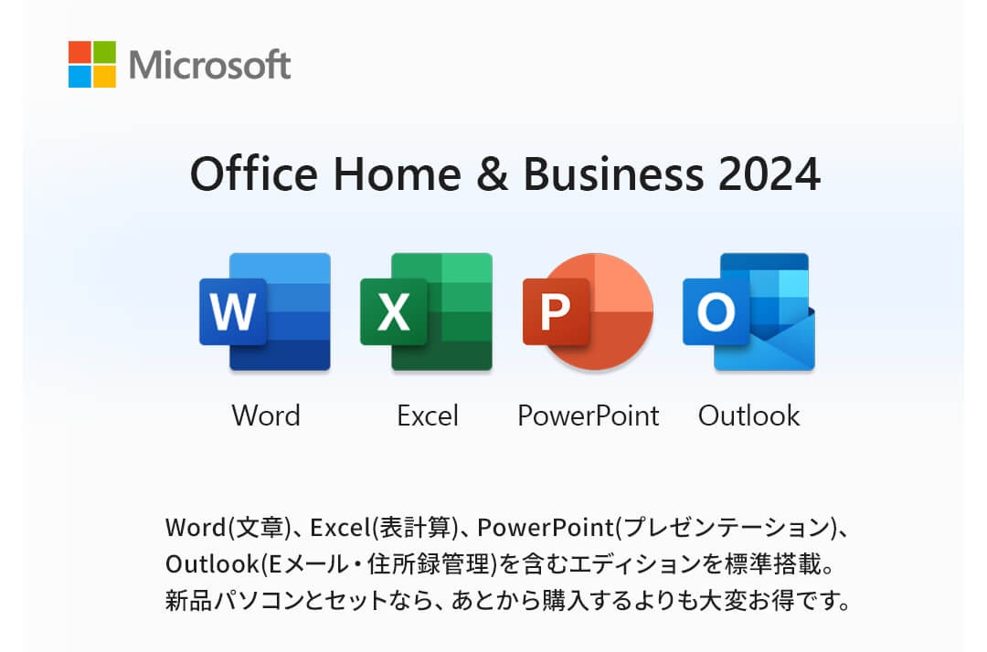 Office Home and Business 2024 バンドル版を、BTOパソコンとセットでお得にご購入できます。Word、Excel、Outlook、PowerPointが含まれており、ビジネスはもちろん、日常の文書作成や情報管理にも幅広く活用可能でき、使い方やライフスタイルに合わせた最適な環境を構築できます。