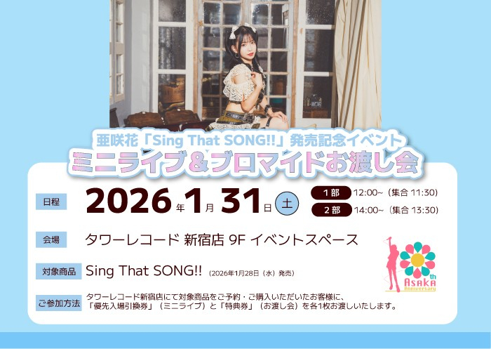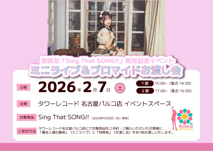 ネットサイン会や東京・名古屋でのミニライブなど、多彩な企画を実施します。対象商品<亜咲花『Sing That SONG!!』ATOM-0015>をご予約・ご購入でご参加いただけます。