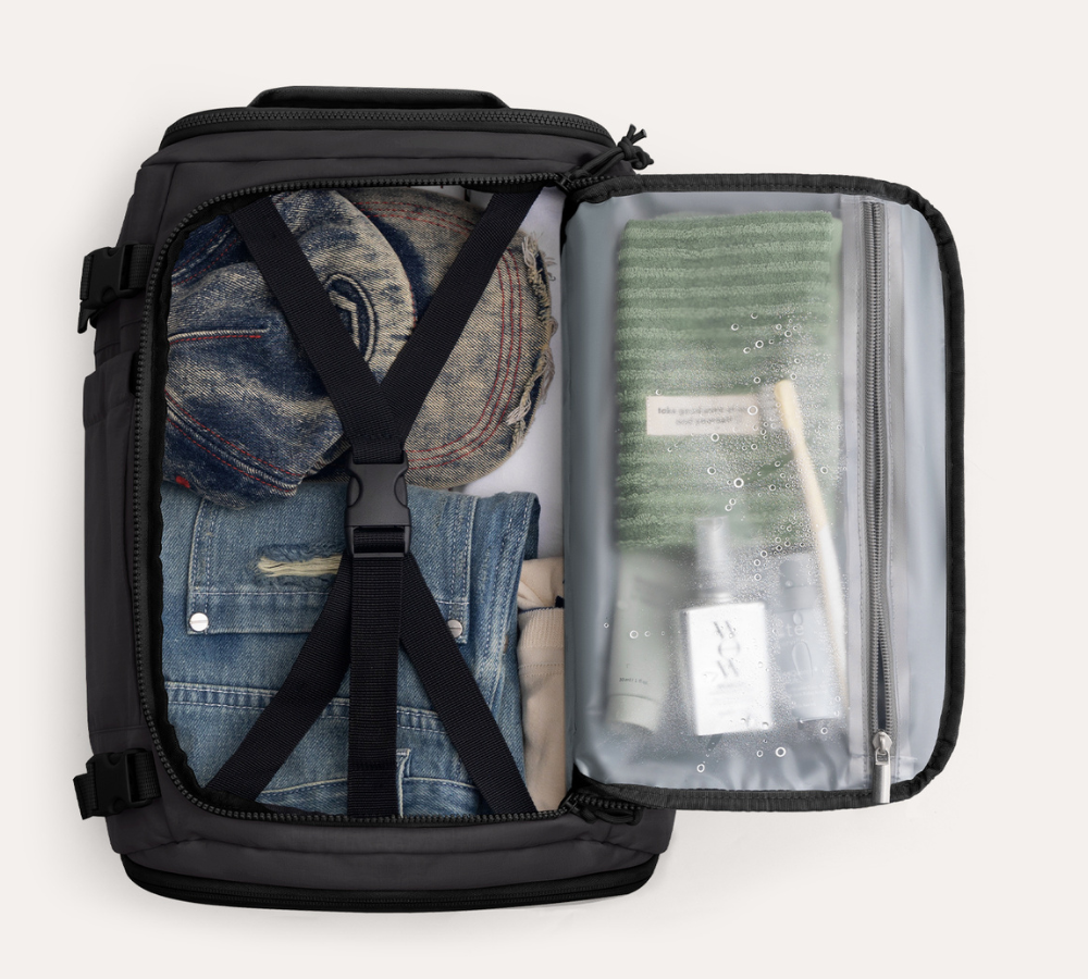 ・容量は28Lと38Lの2サイズ展開 → 1泊から長期旅行まで用途に合わせて選べる