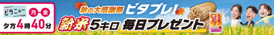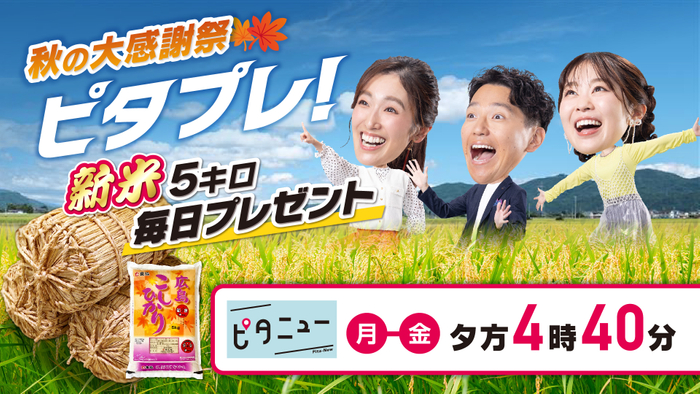 広島ホームテレビ(本社:広島市中区)は9月29日㈪より、新米5キロが毎日当たる「ピタプレ!」をスタートします。夕方4時40分からの放送中に応募電話番号を発表します。