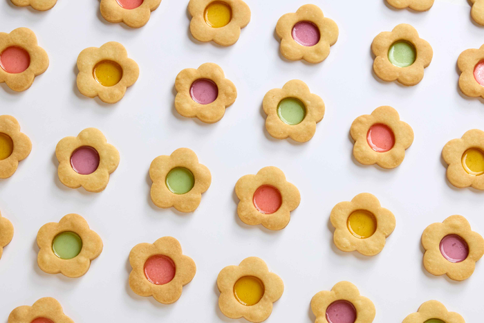可愛らしいお花型のクッキーの中心には穴を空け、フルーツ味の飴を合わせて焼き上げました。薄く伸びた飴はキラキラと輝き、見た目にも特徴的です。使用する飴は、いちご・レモン・ぶどう・メロンの4種類で、甘いクッキーと甘酸っぱいフルーティーな飴の絶妙なコントラストが楽しめます。