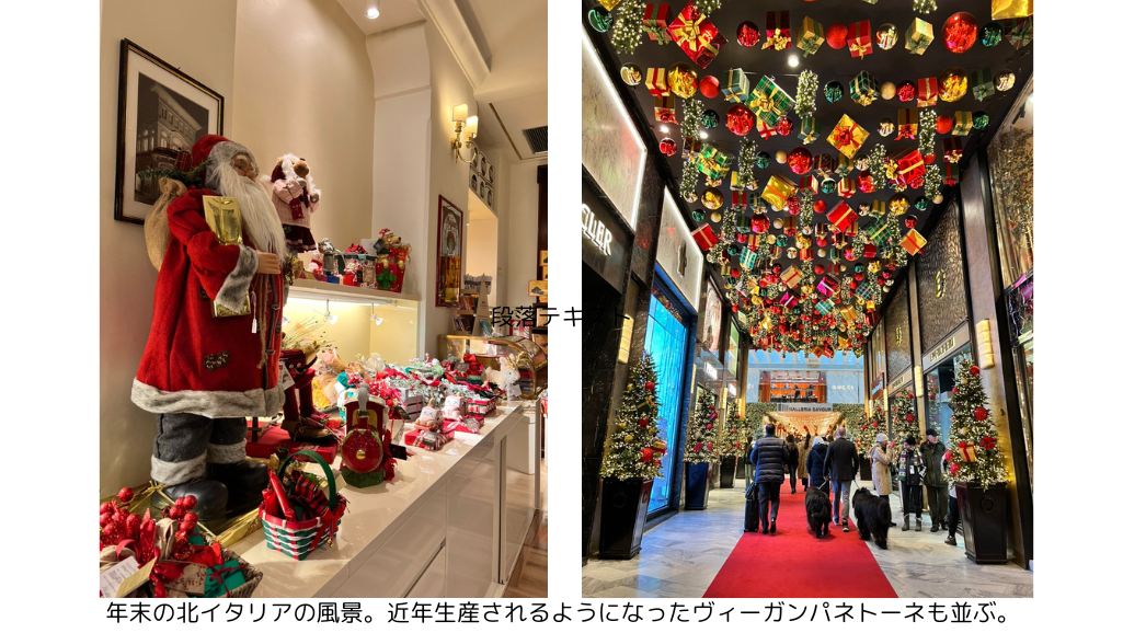 2023年のクリスマスシーズンでは、伝統的なお菓子に混ざり、ヴィーガンパネトーネも並ぶ姿が見られます。これも数年前までは見たことのなかった新しい年末の風景です。