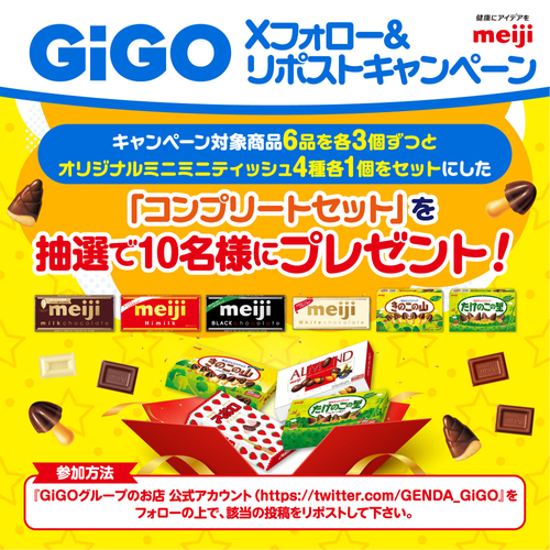 GiGOグループのお店 公式Xアカウント(https://twitter.com/GENDA_GiGO)をフォローし、該当の投稿をリポストされたお客さまの中から抽選で10名さまに対象商品6品各3個とオリジナルミニミニティッシュ4種各1個をセットにした「コンプリートセット」をプレゼントいたします。