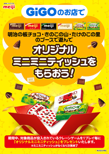 期間中、対象商品(「板チョコ 4種セット」、「きのこの山 たけのこの里 2種セット」)が投入されているクレーンゲームを1プレイごとに、明治のお菓子商品のパッケージがデザインされたオリジナルミニミニティッシュを1個プレゼントいたします。