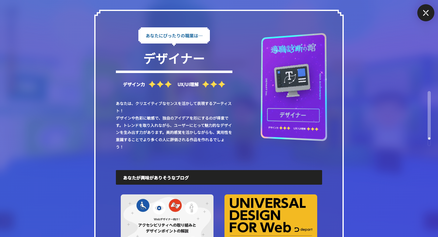 また、デパート社員による実際の回答データとも照らし合わせ、「あなたの回答パターンは、この職種の回答傾向に最も近い」といった、知識とデータに基づいた総合的な適職診断を提供しています。