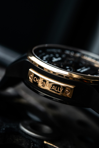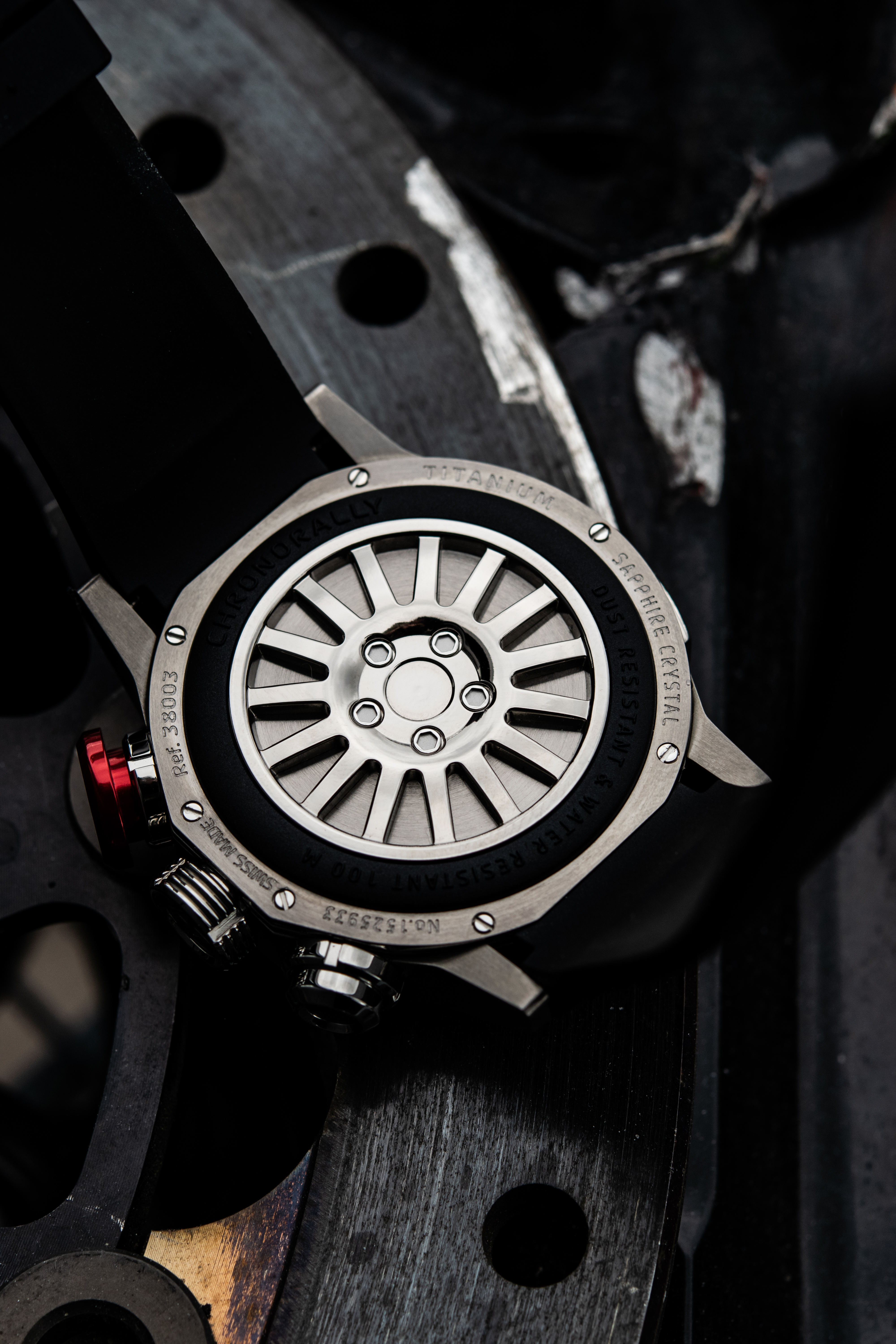 軽量かつ高い耐熱性・強度を誇り、車やバイクなどのパーツにも使用されるチタン製のケース。ケース9時側にはコレクション名を刻印したプレートをセット。モータースポーツへの敬意を表し、タイヤを模した印象的なデザインをケースバックに施しました。