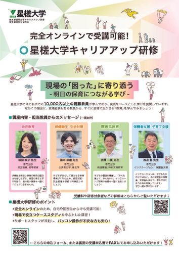 完全オンラインで受講可能な東京都保育士等キャリアアップ研修がスタートします 幼児教育,障害児保育,保健衛生・安全対策,保護者支援・子育て支援の分野を自宅や職場から受講 星槎大学 2025-04-18 20:00 2025年度4月、星槎大学は東京都保育士等キャリアアップ研修指定団体に選定されました。 (研修実施機関番号8114) 完全オンラインで受講可能とし、障害児保育、保護者支援・教育相談の分野を特に手厚く開講し 忙しい現場の保育士の皆様を応援いたします。 以下の特設サイトから、内容の確認とお申込みができます。 東京都保育キャリアアップ研修特設サイト 学校法人国際学園 星槎大学 東京都保育士等キャリアアップ研修 https://careerup-hoiku.seisa.ac.jp/ FAXのお申込みも受け付けておりますので、チラシPDFファイルをダウンロードしてください。 jSgrAnYNmQMtH6ItjqtD 1,915,977 bytes 星槎大学 東京都保育士等キャリアアップ研修 ジャンル: ネット・IT タグ: オンライン 保育士 保育士等キャリアアップ研修 保護者支援 幼児教育 教育相談 星槎大学 東京都 障害児保育 画像一覧 一括ダウンロード ファイル一覧 一括ダウンロード jSgrAnYNmQMtH6ItjqtD