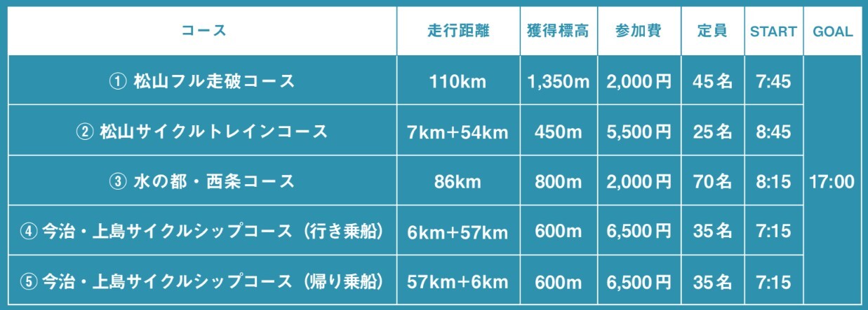 本イベントは、しまなみ海道周辺に広がる「グレーターしまなみ・えひめ」エリアの魅力を体感できるサイクルフェスタです。道後温泉や水の都・西条、ゆめしま海道など、サイクリング以外でも楽しめる地域の資源を巡る、バラエティ豊かな5つのコースを用意しました。