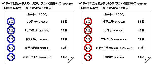 また、【“ダーツを優しく教えてくれそうな”アニメ・漫画キャラ(男性キャラ)】では1位「サンジ(ONE PIECE)」(33名)、2位「ルパン三世(ルパン三世)」(28名)、3位「ドラえもん(ドラえもん)」(27名)、【“ダーツの立ち姿が美しそうな”アニメ・漫画キャラ(女性キャラ)】では「峰不二子(ルパン三世)」(81名)がダントツ、2位「ナミ(ONE PIECE)」(43名)、3位「ニコ・ロビン(ONE PIECE)」(39名)となりました。