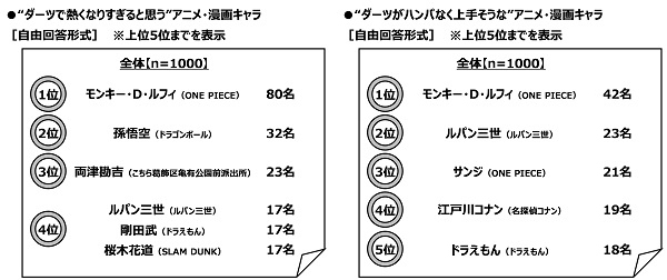 【“ダーツで熱くなりすぎると思う”アニメ・漫画キャラ】では「モンキー・D・ルフィ(ONE PIECE)」(80名)がダントツ、2位「孫悟空(ドラゴンボール)」(32名)、3位「両津勘吉(こちら葛飾区亀有公園前派出所)」(23名)、【“ダーツがハンパなく上手そうな”アニメ・漫画キャラ】では1位「モンキー・D・ルフィ(ONE PIECE)」(42名)、2位「ルパン三世(ルパン三世)」(23名)、3位「サンジ(ONE PIECE)」(21名)と、向上心を強く持ち何事にも全力で取り組むモンキー・D・ルフィが二冠となりました。